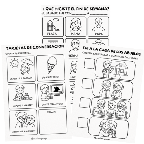 Este material de 12 hojas en PDF en blanco y negro está diseñado especialmente para niños con desafíos en el lenguaje y la comunicación, para trabajar de manera lúdica la expresión oral, la narración y la organización temporal a través de una temática cotidiana y motivadora: contar lo que hicieron el fin de semana.